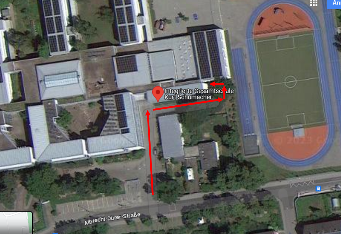 Der Eingang zur Halle befindet sich etwas versteckt hinten rechts ums Eck, gegenüber des Sportplatzes