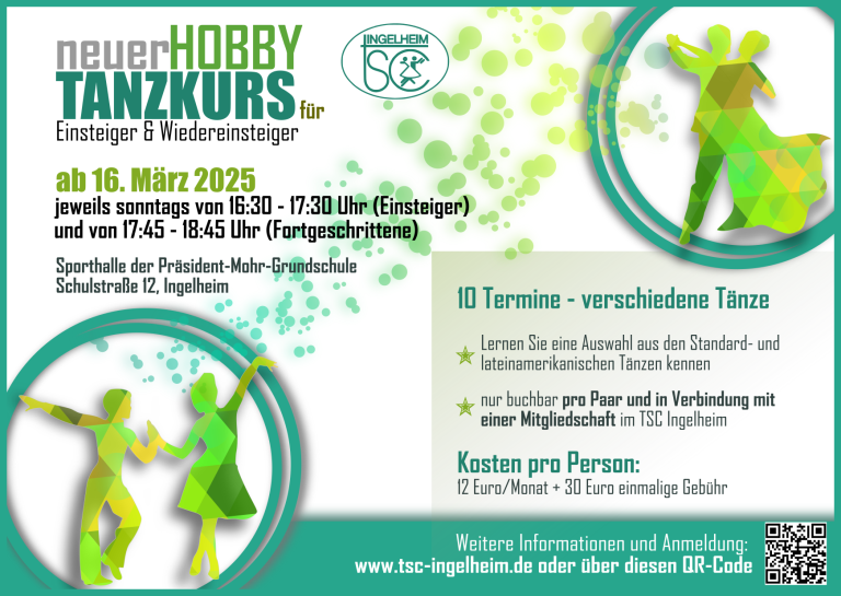 Ab 16. März 2025 bietet der Tanzsportclub Ingelheim wieder zwei neue Hobbytanzkurse an. An 10 Terminen wird immer sonntags eine Auswahl aus den Standard- und lateinamerikanischen Tänzen unterrichtet. Herzlich willkommen sind alle tanzinteressierten Paare. Im ersten Kurs begrüßen wir insbesondere Einsteigerpaare. Der zweite Kurs richtet sich an Fortgeschrittene, die zumindest über Grundkenntnisse verfügen. Im Vordergrund stehen der Spaß am Tanzen in geselliger Runde und die Lebensfreude, die der Tanzsport vermittelt.